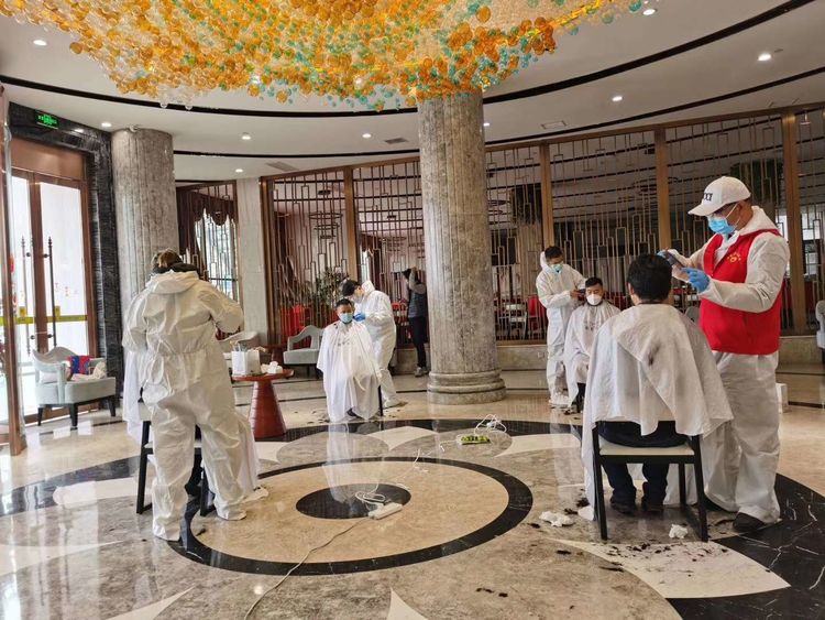 目前正值疫情防控決戰(zhàn)階段,為了確保整個(gè)理發(fā)過程安全有序,此次理發(fā)活動(dòng)選在公司防疫項(xiàng)目建設(shè)人員集中居住的紐賓凱大酒店,志愿者們均由公司指派專人開車提前1個(gè)小時(shí)從漢陽、漢口接至酒店,進(jìn)入大堂之前,所有人員均進(jìn)行了體溫檢測,并分發(fā)口罩,理發(fā)開始后則按照每四人一組進(jìn)行輪換理發(fā),避免人員集中。整個(gè)理發(fā)過程持續(xù)了近4個(gè)小時(shí),在4位理發(fā)師的精心打理下,70余名項(xiàng)目一線人員從“油膩大叔”秒變“帥氣小伙”。
