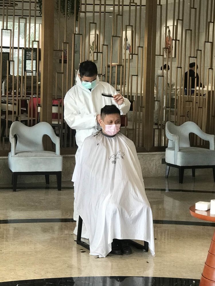 “麻煩幫我剪短點(diǎn),再剪短點(diǎn),兩個(gè)月沒理過發(fā)了,頭發(fā)從來沒這么長過!”3月8日上午10點(diǎn),搬來幾張椅子、拿上幾把剪發(fā)器,“臨時(shí)理發(fā)店”在紐賓凱酒店大堂正式開業(yè)。