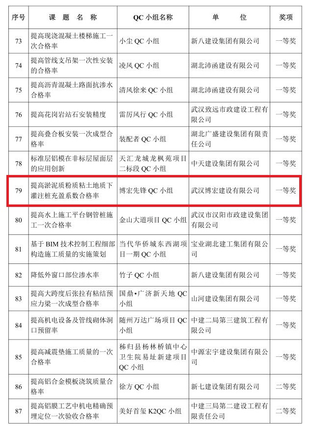 近日,2020年度湖北省工程建設(shè)QC小組活動成果評選結(jié)果火熱出爐。經(jīng)過激烈的評比角逐,博宏建設(shè)獲獎6項,其中一等獎1個、二等獎1個、三等獎2個、優(yōu)秀獎2個。