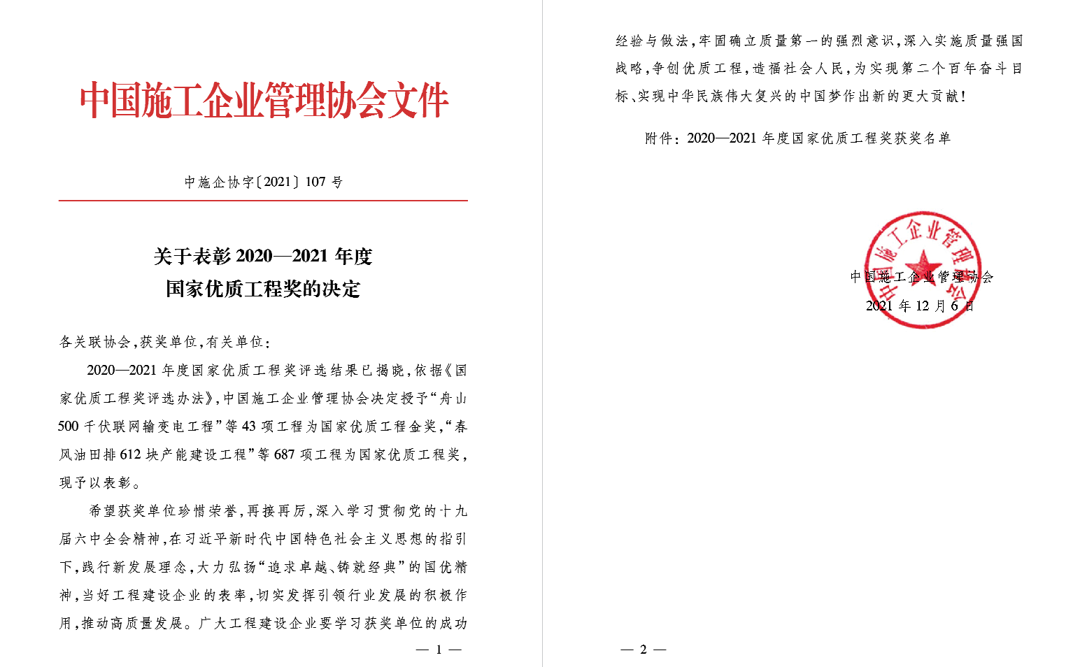 近日,該工程榮獲2020-2021年度第一批地區(qū)國家優(yōu)質工程獎,實現了博宏建設主申報國優(yōu)項目“0”的突破。